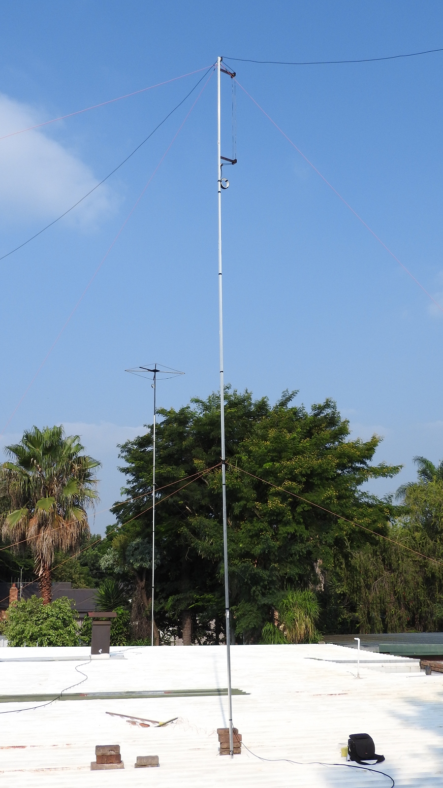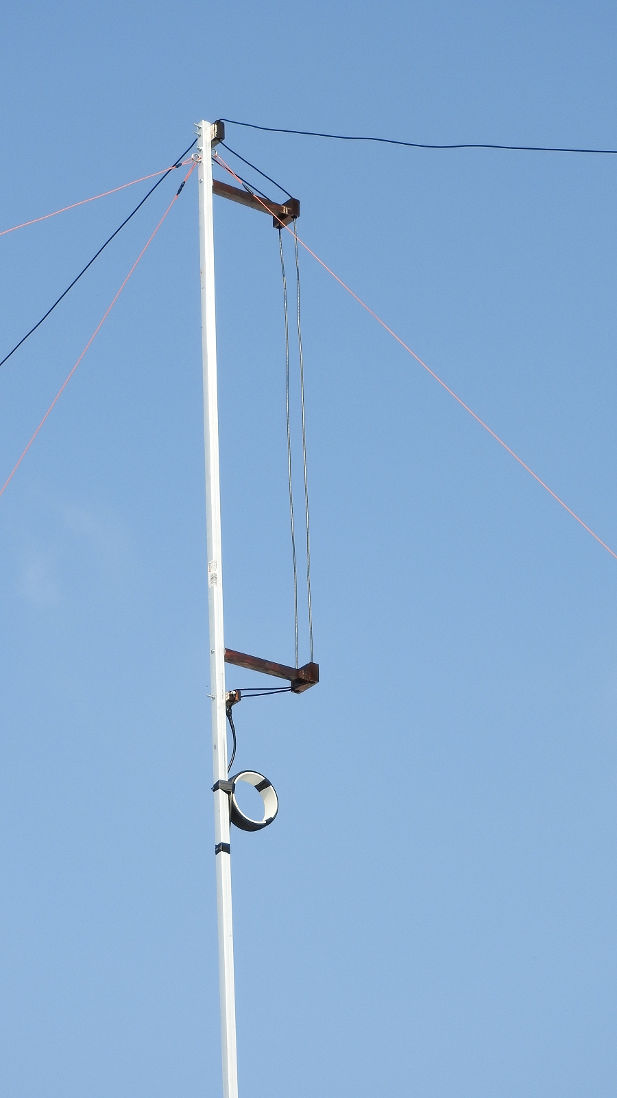 This EDZ design differs to my older one in that an aluminum mast is used as opposed to wood. Using an aluminum mast requires an adjustment be made to the positioning of the ladder line. The ladder line in this case needs to be some distance from the mast to prevent power absorption from the line into the mast. I opted to use wood stand-offs about 20 cm in length (any non-conductive material can be used, e.g. PVC).