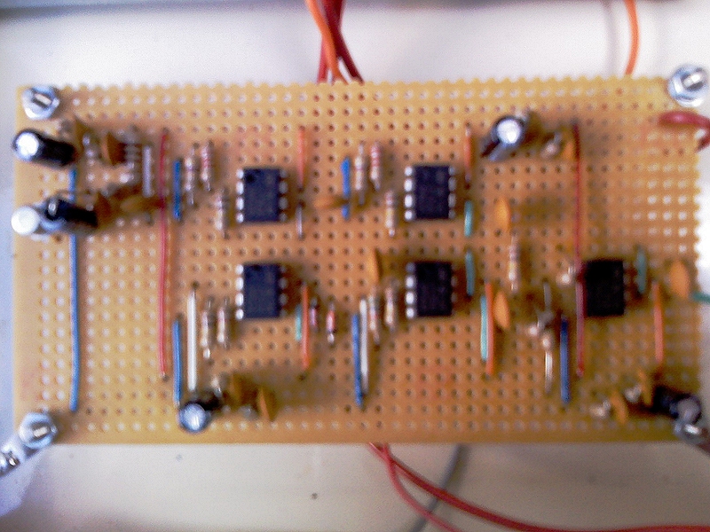 A sawtooth signal generator is shown in figure 1. To ensure the jamming signal sounds natural, white noise is added to the sawtooth signal. To improve stability, consider feeding power to the Operational Amplifiers seperately be means of a voltage divider for each (use the same component values as shown in the schematic).